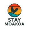Logo of Moakoa Living featuring a black rooster silhouette within a circular background with a sunset gradient, ocean wave, and the text 'MOAKOA Living' underneath.